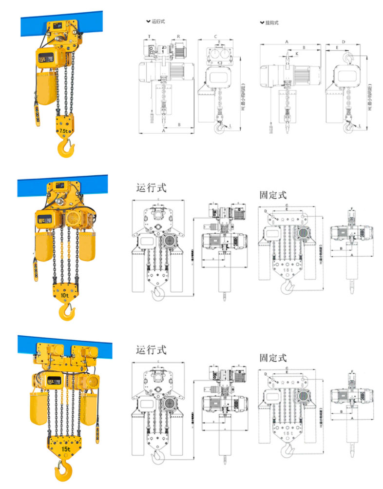 運行式環(huán)鏈電動葫蘆(7.5T-50T)尺寸參數(shù): |